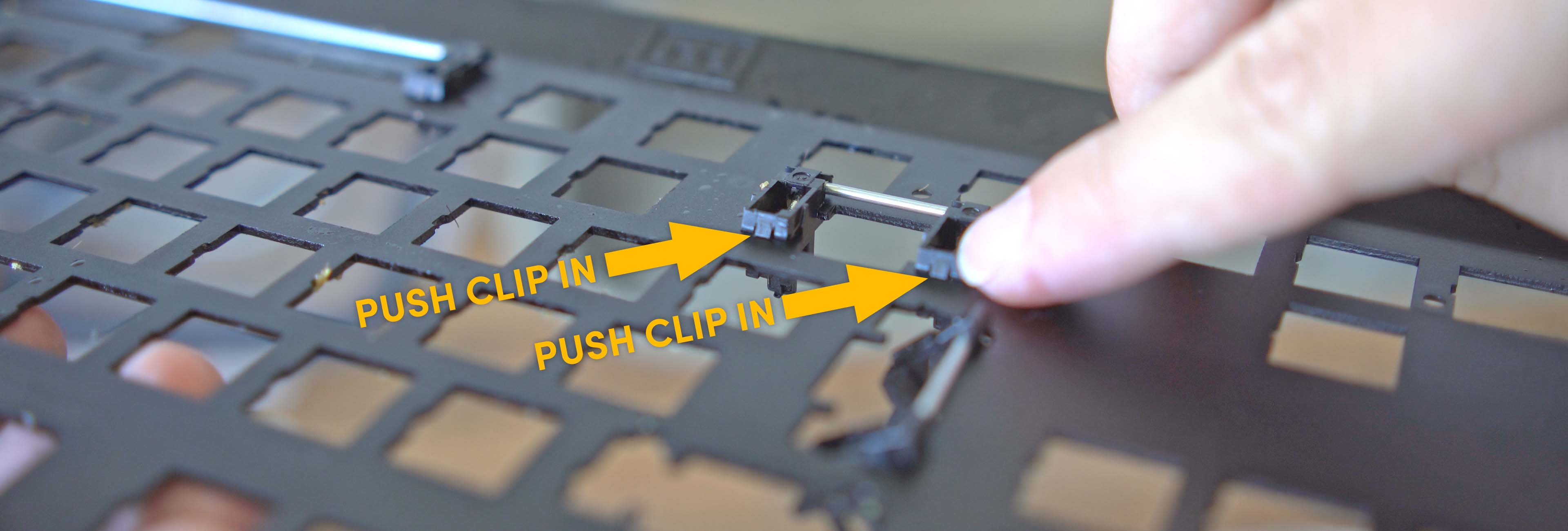 You can easily remove the stabilizers by locating the clips on the back. Push the clips in and push the stabilizer housing downward, and they should be sliding out. Do this for every stabilizer on the board. If there are any crumbles stuck on the stabilizer wire or housing now is the time to remove that as well. If it is clean, we continue to the next step.