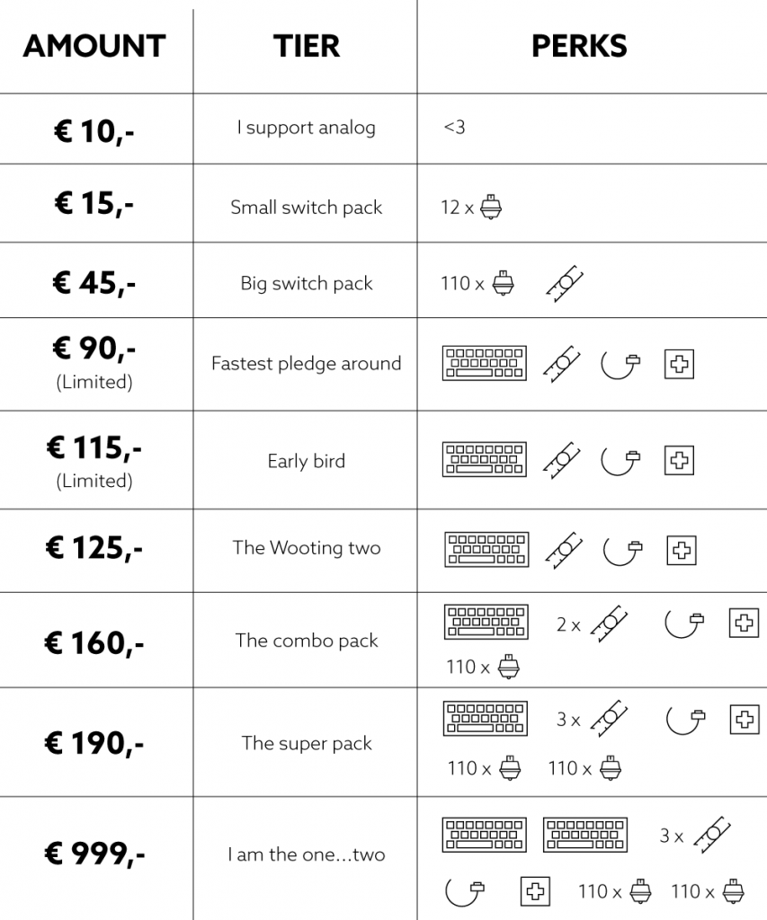 RewardWhat you really payI support analog€10Small switch pack€15 + shipping fee (€5)Big switch pack€50 + shipping fee (€5)Fastest pledge around€100 + Free shipping in Benelux + GermanyEarly bird€130 + Free shipping in Benelux + GermanyWooting two€140 + Free shipping in Benelux + GermanyThe combo pack€180 + Free shipping in Benelux + GermanyThe super pack€220 + Free shipping in Benelux + GermanyI am the one...two€999 + Free shipping in Benelux + Germany